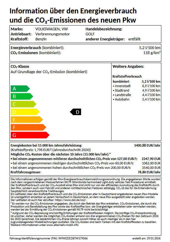 Kraftstoffverbrauch (kombiniert): 5,2 l/100 km, CO₂-Emissionen: 118 g/km