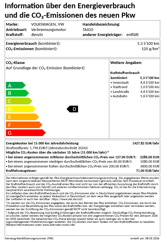 Kraftstoffverbrauch (kombiniert): 5,3 l/100 km, CO₂-Emissionen: 120 g/km