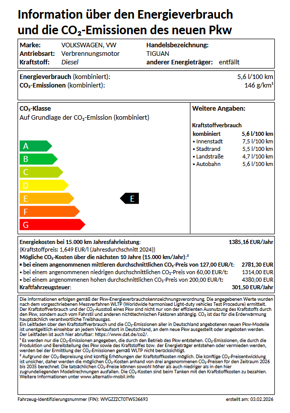 Kraftstoffverbrauch (kombiniert): 5,6 l/100 km, CO₂-Emissionen: 146 g/km