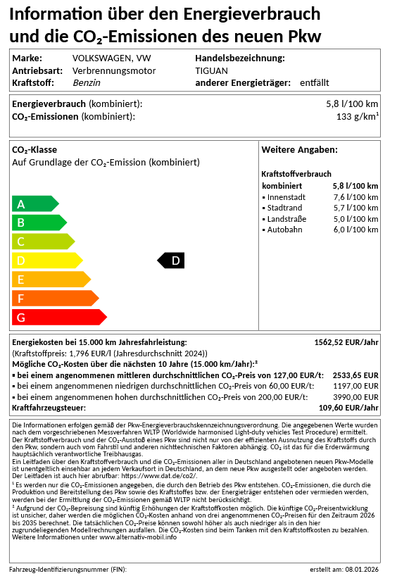 Kraftstoffverbrauch (kombiniert): 5,8 l/100 km, CO₂-Emissionen: 133 g/km